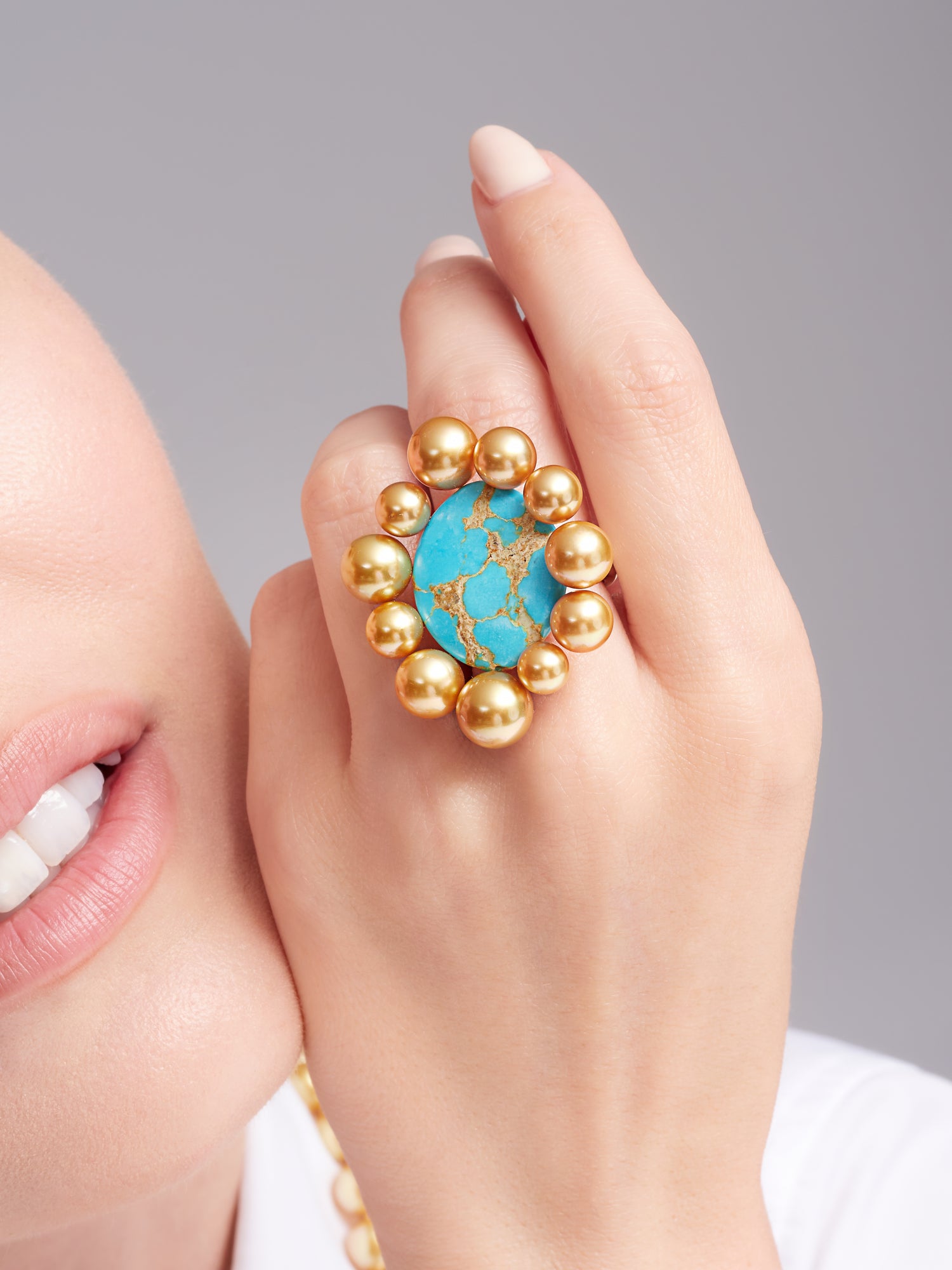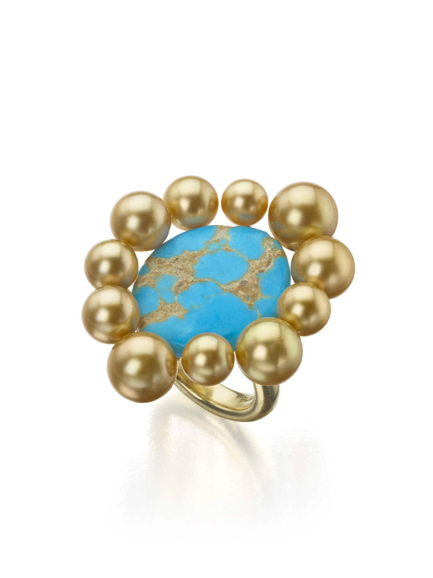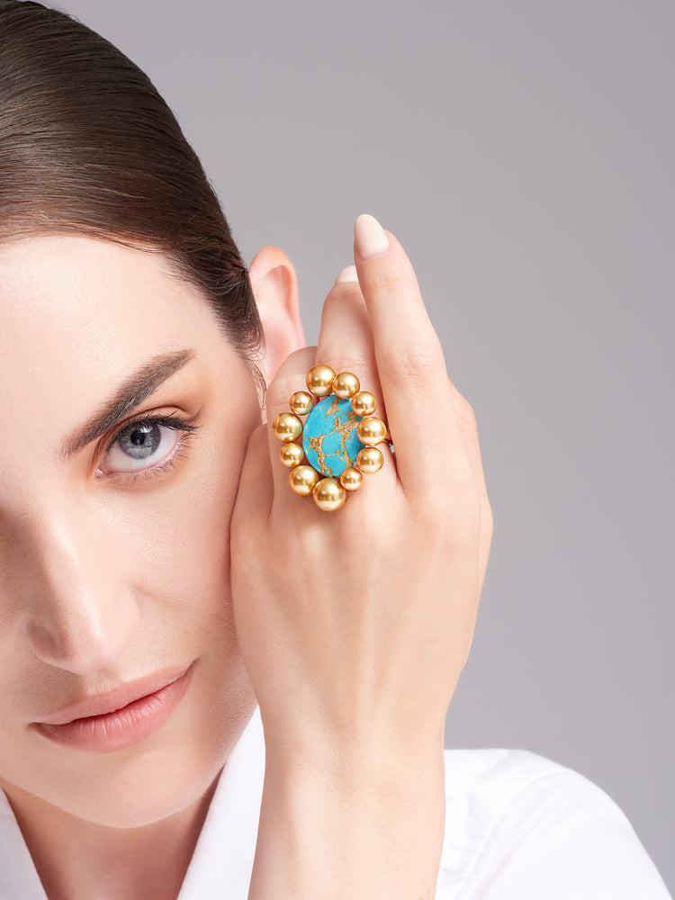 At the center of this ring is a sizable oval turquoise from Mexico. The turquoise's rich blue color adds a bold and striking element to the design. Surrounding the turquoise are 11 Golden South Sea Pearls, ranging from 5.5 to 9.0mm. The pearls contribute to the overall elegance of the ring, each showcasing a lustrous surface and complimenting the veins through the turquoise center.
