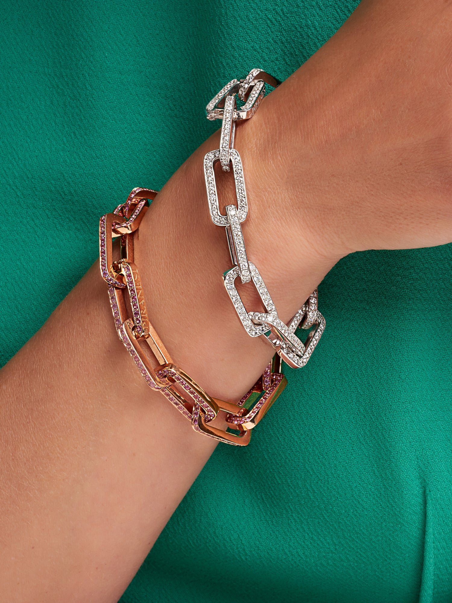 Solid gold, rectangular chain links are glittering in diamonds creating an eye-catching bracelet. Pair with mixed metals for an even cooler look.