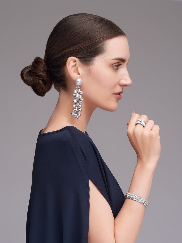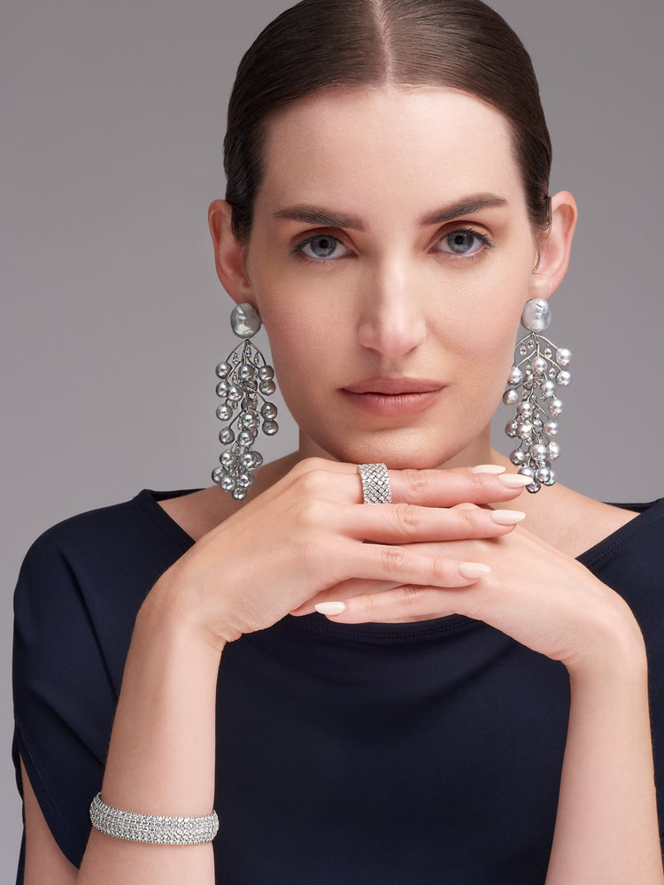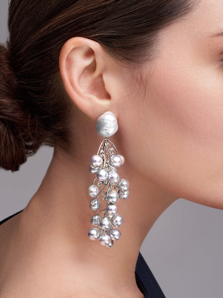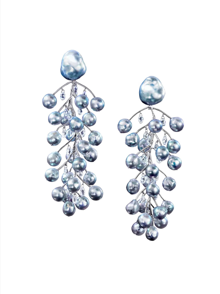 These clip-back earrings are a masterpiece, featuring a design inspired by winter branches. The base elements are two sizable South Sea Pearls, measuring 14.3-18.0mm. Cascading down from the South Sea Pearls are 48 Blue Akoya Pearls, creating a visually striking and harmonious composition. Draping from the "branches" are 40 oval briolette diamonds. These diamonds exhibit exceptional brilliance and sparkle like icicles in the peak of winter.
