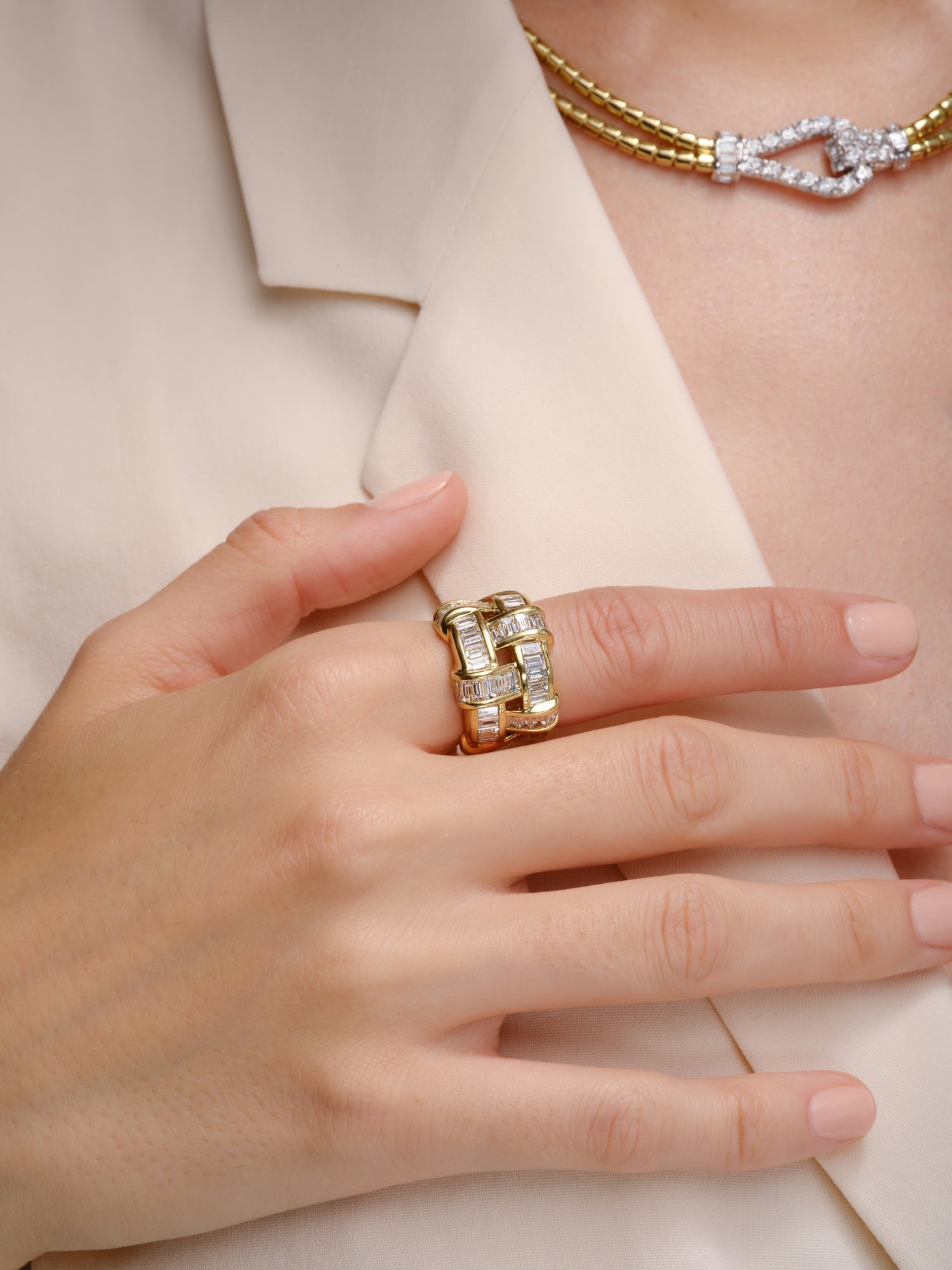 This captivating wide cocktail ring showcases a stunning basketweave design, adorned with sparkling baguette-cut diamonds. Crafted in 18K yellow gold, this piece is a statement of luxury and sophistication.