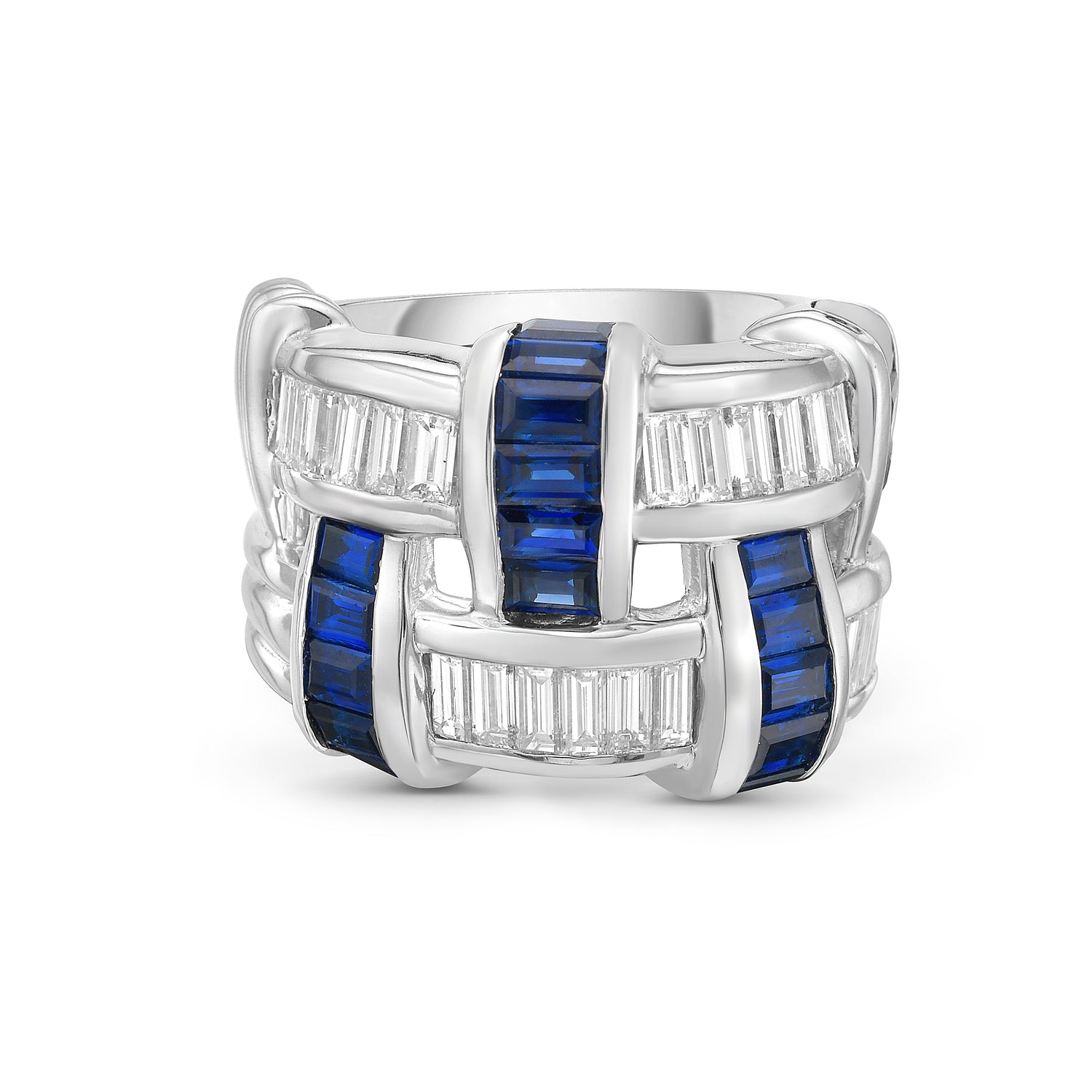 This exquisite ring features a captivating basketweave design, adorned with sparkling baguette-cut diamonds and vibrant blue sapphires. Crafted in platinum, this ring is a luxurious and striking piece.