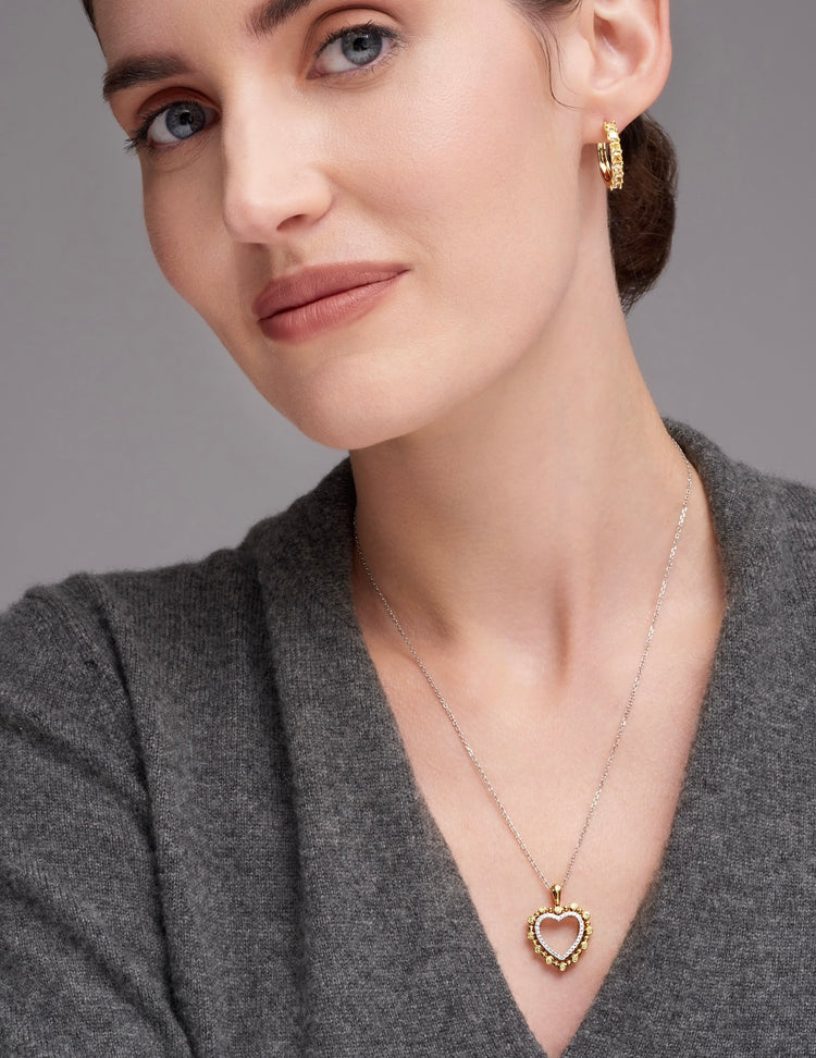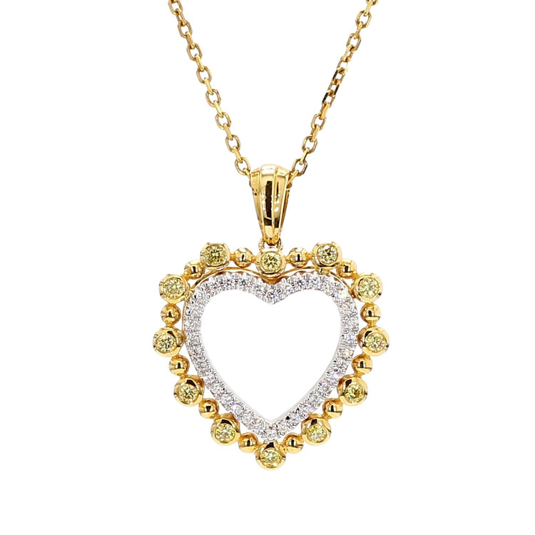 This Yellow and White Diamond Heart Pendant is a beautiful representation of love and sophistication. The pendant features 32 Brilliant Round Natural White Diamonds, totaling 0.16 carats, and are thoughtfully arranged to create a vibrant heart shape. Accentuating the white diamonds are 12 Brilliant Round Yellow Diamonds, each weighing 0.02 carats. The yellow diamonds form a delicate halo around the heart, adding a warmth and uniqueness to the design.