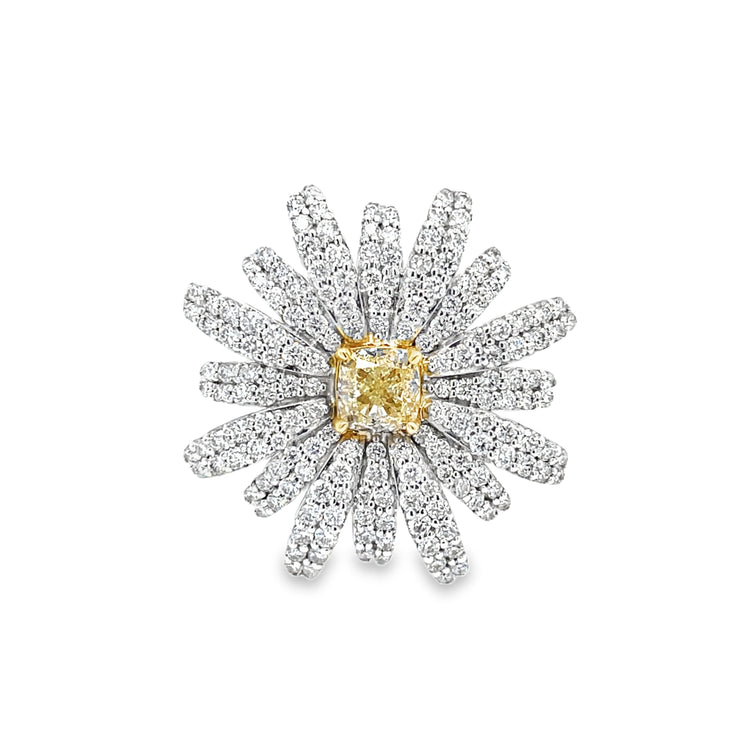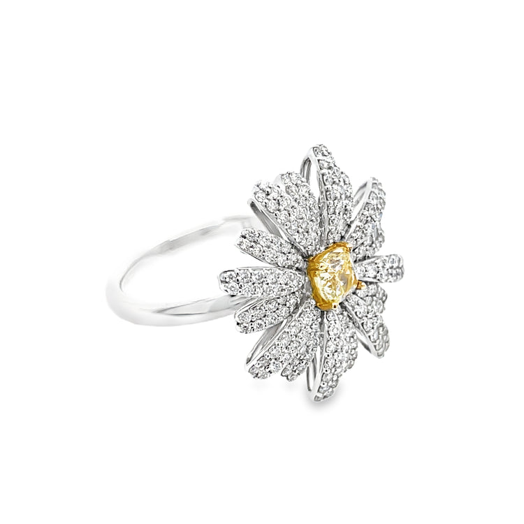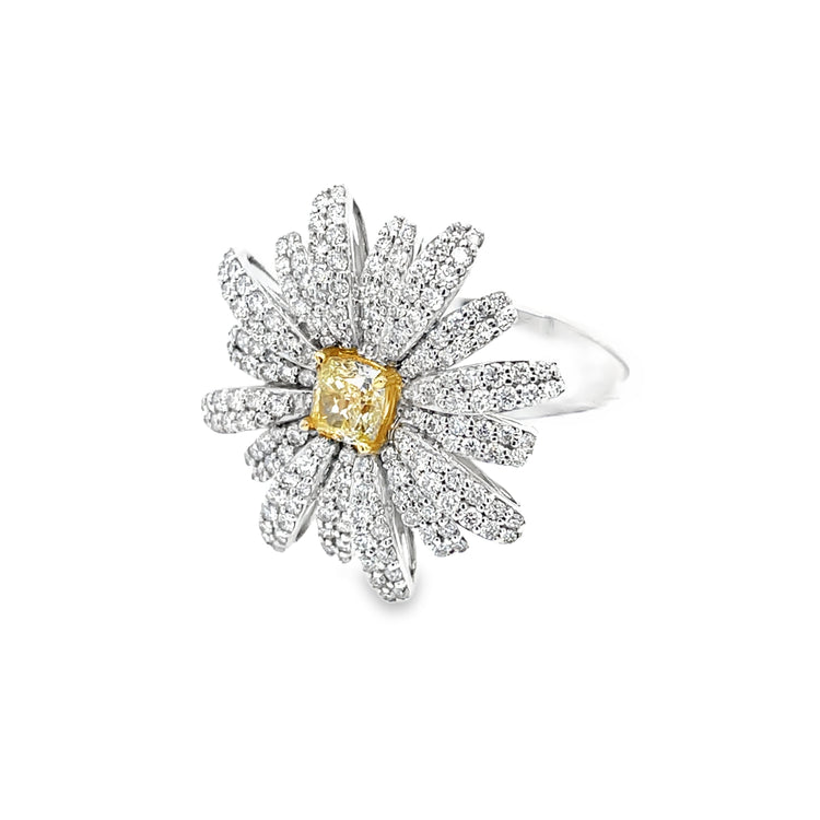 Celebrate the season or the holidays with this snowflake-shaped diamond ring. 176 white diamond branches alternate in length and frame a 0.50-carat cushion cut fancy yellow diamond. This ring is great as a new piece to wear to all those holiday parties and even better when paired with its matching pendant.
