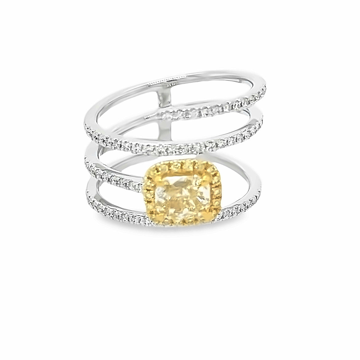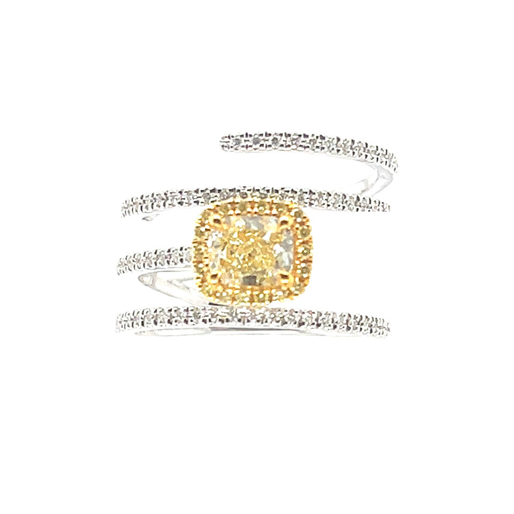 At the center of the ring is a radiant-cut yellow diamond with a weight of 1 carat. The diamond is categorized as Color Y-Z, indicating a warm yellow hue. Additionally, the coil includes 18 brilliant round yellow diamonds with a combined weight of 0.10 carats, surrounding the focal point. The ring design incorporates a coil-like arrangement, featuring a total of 69 brilliant round white diamonds with a combined weight of 0.29 carats.