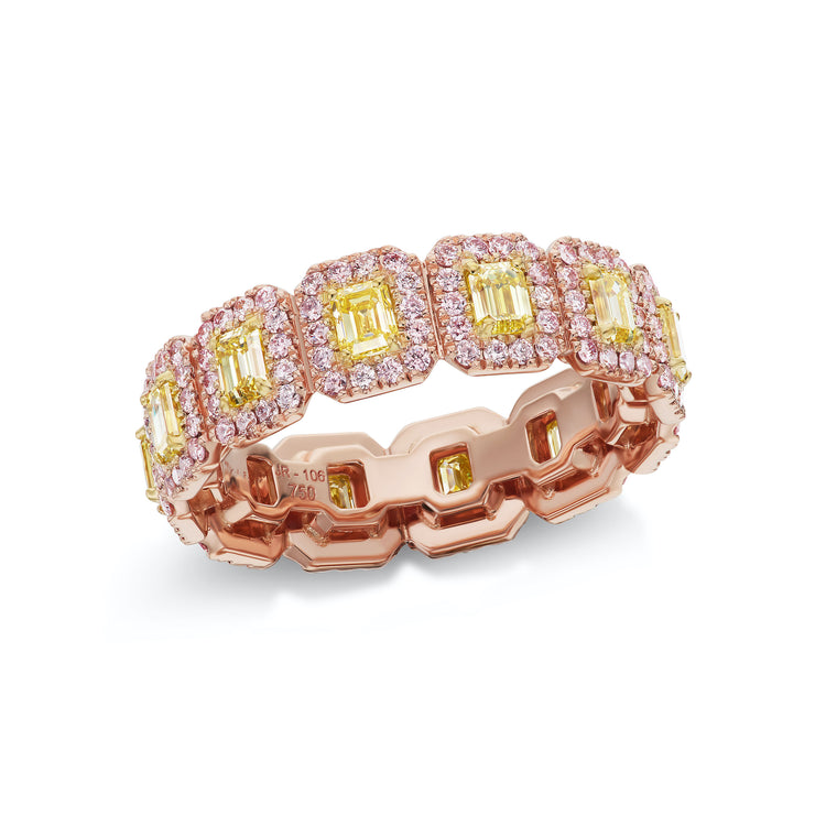 This eternity band is a symbol of refined elegance and individuality. Its design gracefully interlaces the unique yellow diamonds with the soft, feminine charm of the pink diamonds, creating a harmonious and captivating visual appeal.
